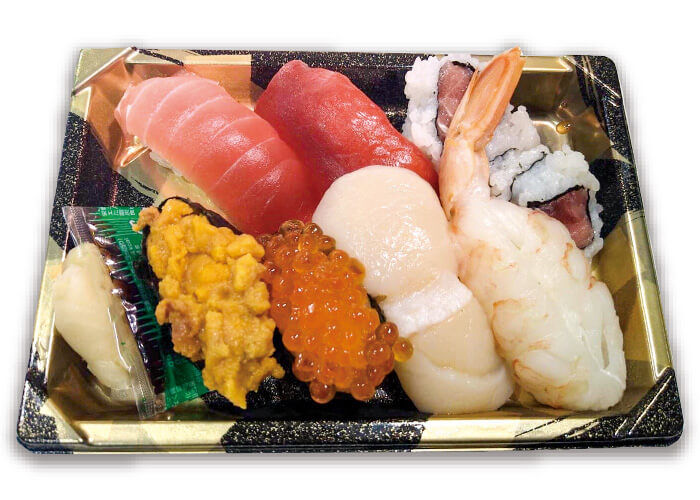 厳選ネタ、インド鮪中とろ、鉄火ウラ巻、ウニ、イクラ、大きなホタテ、生エビのにぎり詰め合わせです。