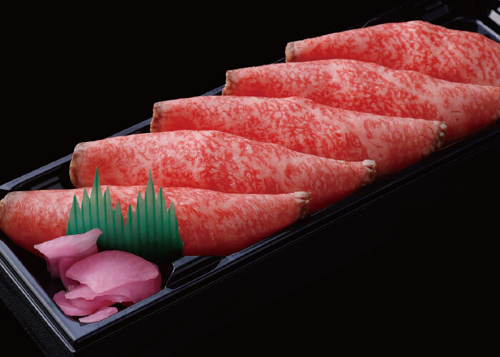 黒毛和牛A5ランクのとろけるローストビーフを握り寿司でお楽しみください。