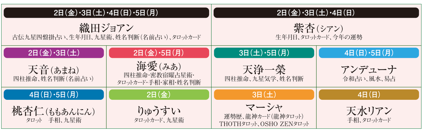 ※事前予約は承っておりません。(当日、会場での受付のみ) ※占い師は日替わりで登場します。 ※マッピーポイント対象外。 ※隣会場のステージイベントの音により、声が聞き取りにくい場合がございます。